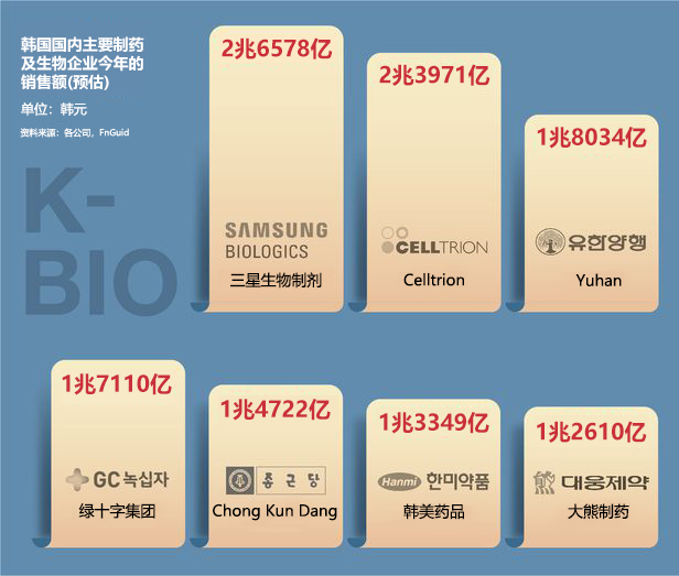 韩国国内制药、生物产业与IT(信息技术)和汽车产业相比规模较小,个别企业的规模也与海外制药公司相比相对较小。但是随着以三星生物制剂和Celltrion为中心的生物业界的急速发展,进军海外市场也越来越活跃。2020年销售额突破1万亿韩元的三星生物制剂仅用2年时间就进入了销售额突破2万亿韩元的时代。Celltrion在2019年销售额首次超过1万亿韩元后,正在稳步发展。据韩国金融信息服务机构FnGuide透露,预计今年的销售额为2.3971万亿韩元(约合128.5亿元人民币)。