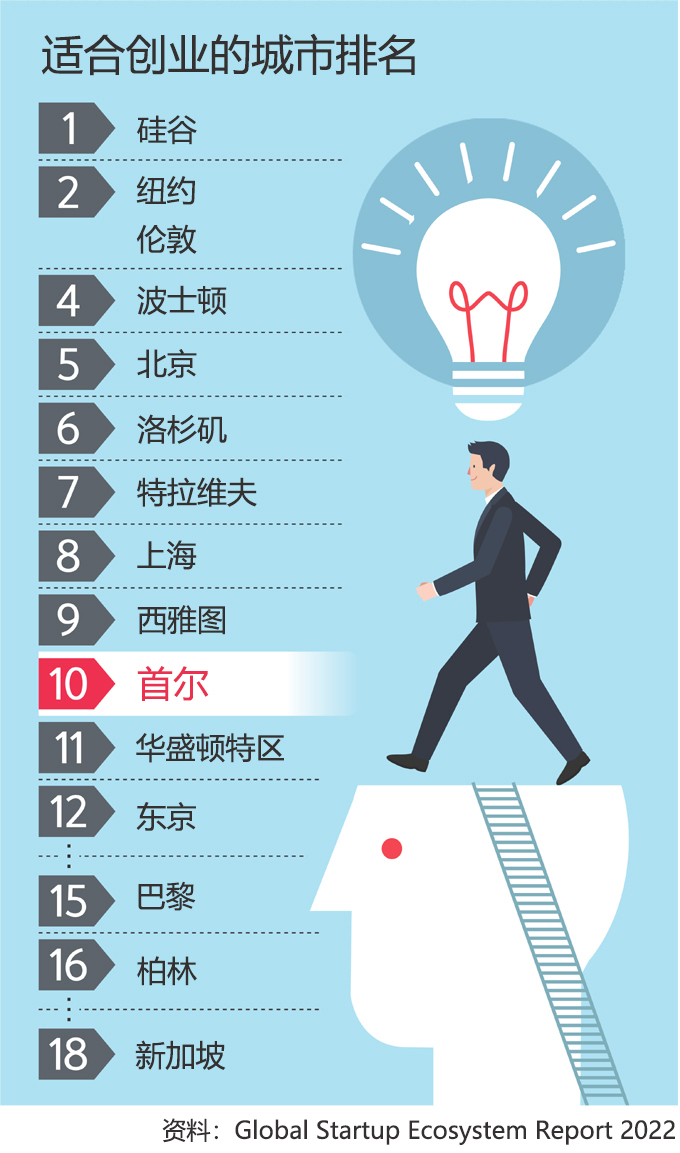 6月14日,美国知名创新政策咨询公司基因创业(Startup Genome)以100个国家的280个城市为对象进行调查的《2022全球创业生态系统报告》中,首尔位居适合创业城市的第10名,创下了历史最高纪录。最近几年,首尔排名持续上升,2021年排在第16名,排名上升6位。
