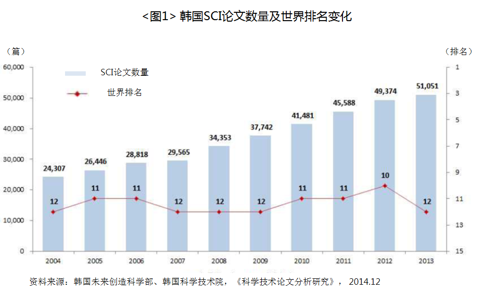 ![]() http://www.kistep.re.kr/c3/sub6.jsp?brdType=R&bbIdx=1757 <图1> 韩国SCI论文数量及世界排名变化 <图2> 韩国每万名人口SCI论文数量及世界排名变化 <表1> 韩国SCI论文及GDP增长率比较 <表2> 2013年主要国家单篇SCI论文平均被引用次数 |