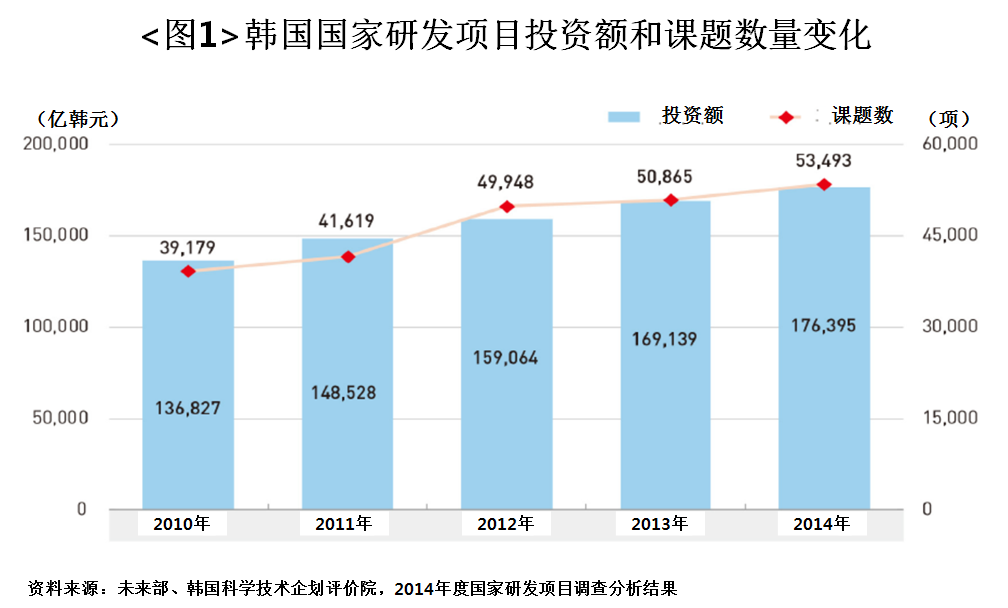 ![]() 本文按照韩国科学技术企划评价院(KISTEP)最近发布的《2014年度韩国国家研究事业投资现况》报告书整理了2014年韩国国家研发投资情况。详细内容请见图示。 <图1>韩国国家研发项目投资额和课题数量变化 <图2>2014年韩国国家研发投资按部委分布比重 <图3>韩国国家研发投资按执行部门分布 <图4> 2014年韩国国家研发投资按活动类型分布 <图5>2014年国家研发投资按技术领域分布 |