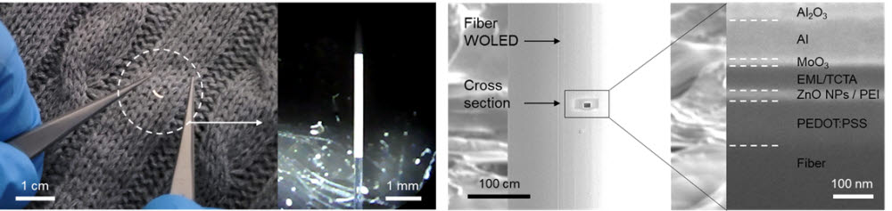 研究组注意到适合纤维结构的白色单一发光层,在纤维上首次实现了白色OLED。为了在户外也能看清,保证了最高每平方米700cd/m²的亮度及10cd/A的电光学性能。得益于能量传达过程的优化结构,可以展现稳定地呈现白色发光。将此前纤维显示器领域没有的显示器必须要素——白色OLED体现在一根线上。