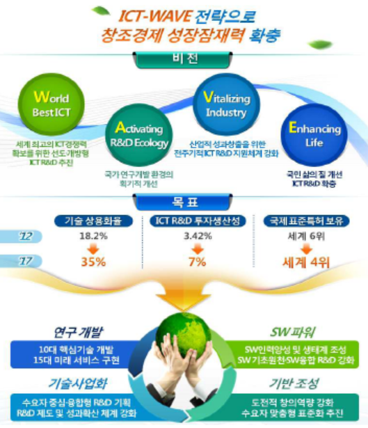![]() 韩国未来创造科学部网站 全文请见附件。 10月23日,韩国第23届“经济关系部长会议”通过了未来创造科学部(以下“未来部”)提交的《ICT R&D中长期战略(又名ICT WAVE战略)》,战略确定了今后5年韩国信息通信技术(ICT)领域的研发(R&D)政策及方向。 此战略为称为“ICT WAVE战略”。战略中,韩国未来部为增强创意经济发展潜力提出了4大愿景:(W)取得世界最高水平的ICT竞争力(World best ICT),(A)大幅改善研究环境((Activating R&D ecology),(V)创造产业成果(Vitalizing industry),(E)改善国民生活质量(Enhancing life)。 WAVE战略的目标:今后5年之内技术商用化率达35%(现为18%),ICT R&D投资生产率达7%(现为3.42%);国际标准专利保有量居世界第4位(现为第6位)。 为实现上述目标,未来部计划在内容(C)、平台(P)、网络(N)、设备(D)、信息保护(S)等5个领域开发10大核心技术,培育新发展动力、率先占领全球市场。此外,为以10大核心技术为基础建设富裕幸福的社会,未来部选出15大未来服务并计划重点推动其实现。 以下是韩国《ICT R&D中长期战略》概要: I. 背景 ICT是主导经济发展、通过与其他产业的融合创造新的就业岗位、实现“创意经济”的核心方法。未来部组织160余名专家,经多次调研和讨论,并召开听证会,提出了今后5年 ICT R&D方向、树立了开发新技术服务的推进战略。 II. 现况及问题 韩国过去一段时间疏忽ICT的进步与发展,这造成了产业竞争力的下降,基于ICT的产业融合效果也受到影响。韩国国内ICT产业竞争力(EIU)世界排名:2008年第3位 → 2011年第19位。 现在ICT产业领域存在以HW、大企业、成品为主的发展等3个不均衡发展现象,这些现象的深化是构建健康的创造型生态系统的妨碍因素。韩国SW产业竞争力(SERI,2011年)在 OECD19个国家中居第14位。 另外,ICT R&D成果不足,代表性的创造性成果更是尚未出现。 III. ICT R&D战略(2013~17年) 1. 愿景:通过ICT WAVE战略加强创意经济发展潜力。 2. 目标:今后5年内技术商用化率达35%,ICT R&D投资生产率达7%,国际标准专利居世界第4位。 3. 主要实施课题:开发10大核心技术、实现15大未来服务、加强SW Power、促进技术产业化、扩大R&D基础。 IV. 主要实施课题 1. (研究开发)开发10大核心技术 → 实现15大未来服务 (1) 为率先占据“内容(C)、平台(P)、网络(N)、设备(D)、信息保护(S)”等5大领域的全球市场,重点实施10大核心技术开发。10大核心技术以占领全球市场为目的,在分析未来需要和成功可能性的基础上选出。 10大核心技术促进方向如下: ▷(内容)开发人性化的完全立体3D影像及开放参与型内容技术; ▷(平台)开发表现像人一样认知判断的SW技术、各种设备之间的通信服务基础技术、从巨大的数据中创造所需信息的计算技术等; ▷(网络)开发比现在快1000倍的第5代移动通信(5G)技术、超宽带有线网络技术; ▷(设备)开发利用人类五感的感性型终端技术、体现ICT融合新服务的核心传感技术; ▷(信息保护)探索新的网络保安威胁,开发实时应对技术。 (2) 基于国家、社会发展趋势和国家面临的问题,为给国民创造更多的富裕和幸福,选出15项代表性服务并重点推动其实现。15项服务以10大核心技术(基础原创及商用化)为基础,围绕未来需求综合考虑政策性、技术性、市场性和竞争力等。 2. (技术产业化)为提高R&D成果,提高R&D全过程效率 (1)(计划) 实施反应国民和企业创意和需要、以需求者为中心的R&D计划,扩大机关、技术、政府出资研究机构、政府之间的合作R&D计划。 建设ICT各领域民间企业联合组织,积极反应R&D过程中的意见。主要领域包括创意融合、移动通信、网络、电波、广播、信息保护、基础SW和电脑、融合SW、智能服务、数字内容。 (2)(评审、管理) 改善有关体制和制度,以根据R&D特点提高评审、管理的专业性,提高产业化R&D的成功率。 所有研究期限中,1/6以上时间用于技术转移、产业化。 (3)(成果普及) 通过对追加R&D(R&BD)的支持、构建技术交易基础、加强多部门合作网络等提高R&D成果的可信度,以此推进成果普及。 基于应对需求型商用化,有选择的支持追加R&D;建设公共、民间R&D成果交易、技术信息共享平台;构建技术产业化合作体制。 V. 推动体系 1. 加强与多部门、民间的合作 在总理室信息通信战略委员会下设立“(暂名)信息通信融合专门委员会”,挖掘多部门课题、推动意见协调。 2. 设立信息通信技术振兴院(专业机构) 可以完成R&D政策→计划、评审、管理→产业化的全周期支持的、单一化的ICT R&D专业机构。整理组合分散在现有各机构(NIPA、KEIT、KCA、KOCCA、KIAT)的ICT R&D管理及产业化功能,建设R&D全周期支持体系。 VI. 期待效果 1. 如果今后5年之内(2013~17年)的R&D投资能达8.5万亿韩元,那么有望带动12.9万亿韩元的生产、创造7.7万亿韩元的附加价值、增加18万个就业机会。 2. 通过树立ICT R&D政策方向,创造世界水平的ICT技术开发成果,发展创意经济、增进国民幸福。 ■ 资料来源:韩国未来创造科学部,《ICT R&D中长期战略(ICT WAVE战略)》,2013.10.24 <表1> 10大核心技术 <表2> 15大未来服务概念及期待效果 <表3> ICT R&D投资的连锁效应 全文请见附件 |