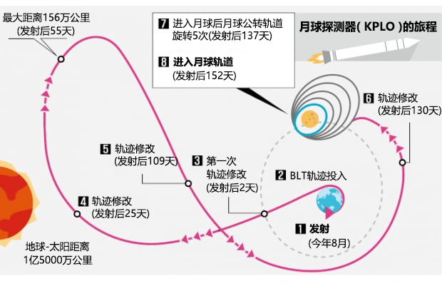 离开地球的KPLO被太阳重力场吸引,到达距离地球约150万公里的太阳附近的内拉格朗日点(两个以上天体接收的引力相同的地方)。之后再次被地球和月球的重力场所吸引,朝着相反的地球方向画着结状的轨迹进行游泳。 在接近月球的月球公转轨道上转5次,执行缩小轨道直径的“进入行动”。