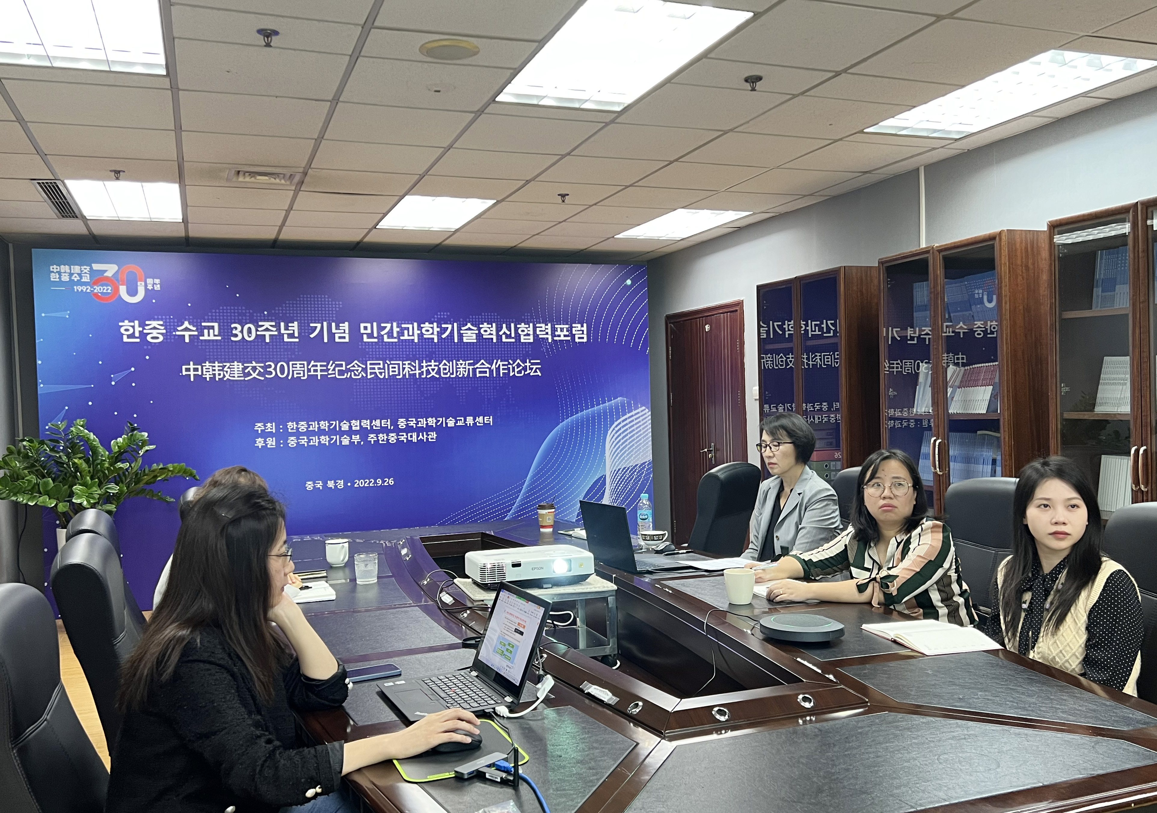 9月26日上午,为纪念中韩建交30周年,进一步推动中韩民间科技创新务实合作、深化两国新时期科技界合作与交流,“科创共赢”中韩民间科技创新合作论坛以线上线下结合的方式成功举办。本次论坛是在中国科技部和中国驻韩国大使馆的支持下,由中国科学技术交流中心和韩中科学技术合作中心联合主办的活动。来自中韩两国大使馆、科技部、各地方相关机构、高校及科研院所的代表们线上参会。韩中科技合作中心、中国科学技术交流中心、中国驻韩国大使馆等机构的相关人士分别在北京和首尔分会场现场聆听了此次会议。