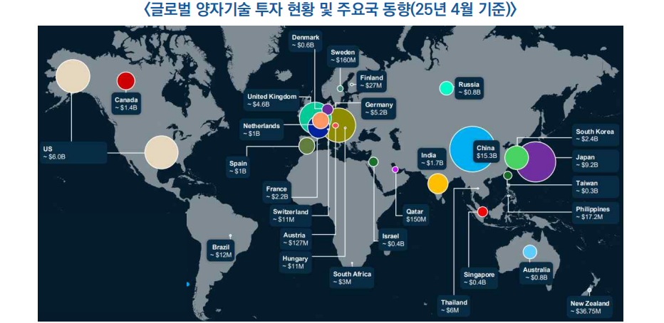 (투자) 글로벌 양자기술 분야의 투자 규모가 민·관 부문 모두에서 빠르게 확대되고 있으며, ′25년 4월 기준, 전 세계 공공부문 양자기술 투자 규모는 540억 달러에 달함
