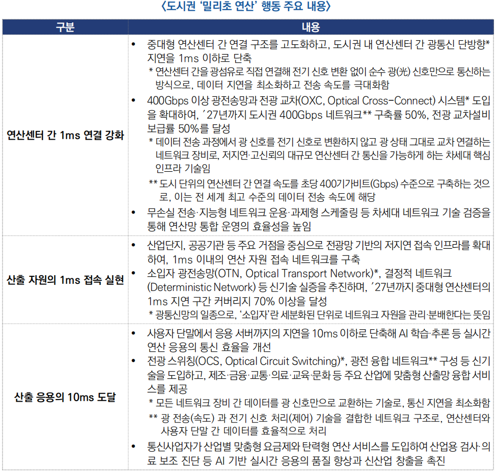 (목표) 전국 도시권 내 1밀리초(ms) 단위 초저지연 연산 네트워크 구축을 목표로 하며, 연산센터 간 연결·핵심 산업거점 접속·응용단말 서비스 지연을 각각 1ms·1ms·10ms 이하로 단축