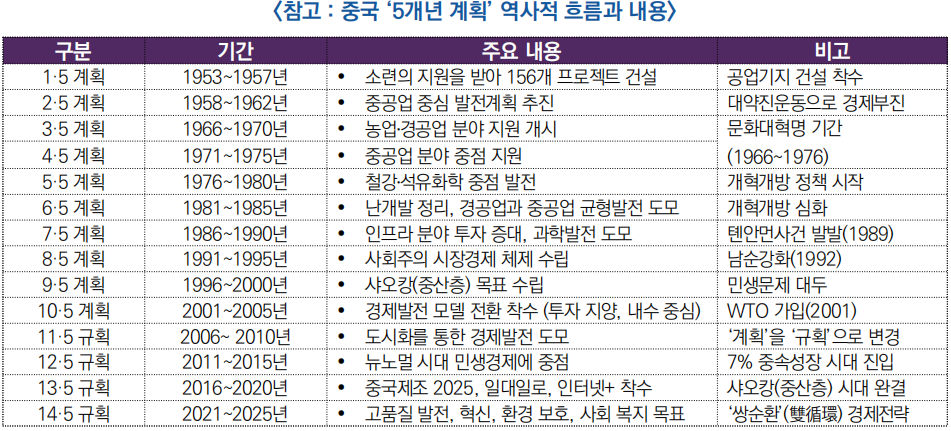 (배경) 중국은 구소련의 ‘5개년 계획’을 본받아 1953년부터 자체 ‘5개년 계획’을 시행했으며, 대약진운동(大躍進運動)으로 중단된 3년(1963~1965년)을 제외하고는 지속적으로 추진해왔음