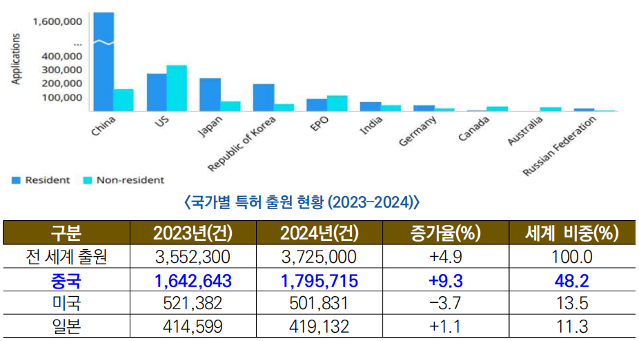 - 중국의 특허 출원은 전년 대비 9.1% 증가한 179만 5,715건으로, 전 세계 특허의 48.2%를 차지하며 압도적 1위를 기록하고 이는 2위 미국(50만 1,831건)의 3배 규모이며, 뒤이어 일본(41만 9,132건), 한국(29만 5,772건)이 순위를 이었음