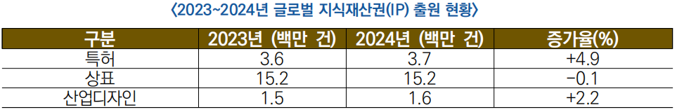 □ 세계지식재산기구(WIPO)가 최근 발표한‘세계 지적 재산권 지수 2025’ 보고서에 따르면 2024년 전 세계 지식재산(IP) 활동은 특허·상표·디자인 모두 증가세