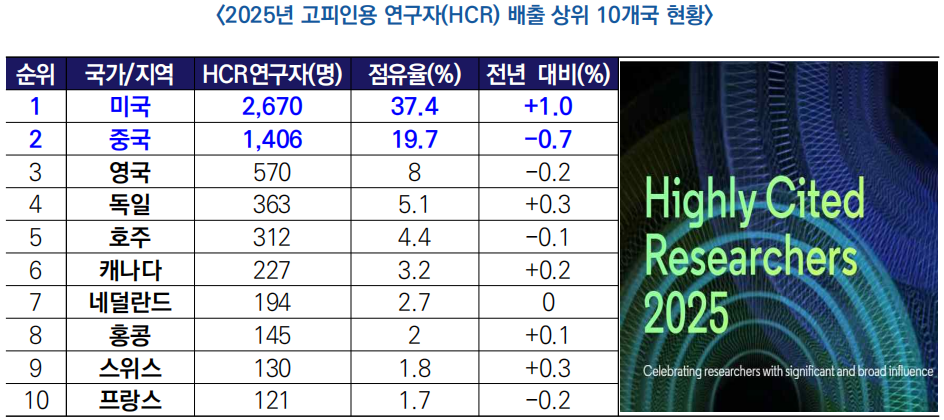 2025년 세계 상위 1% 연구자(HCR) … 美 1위, 中 2위