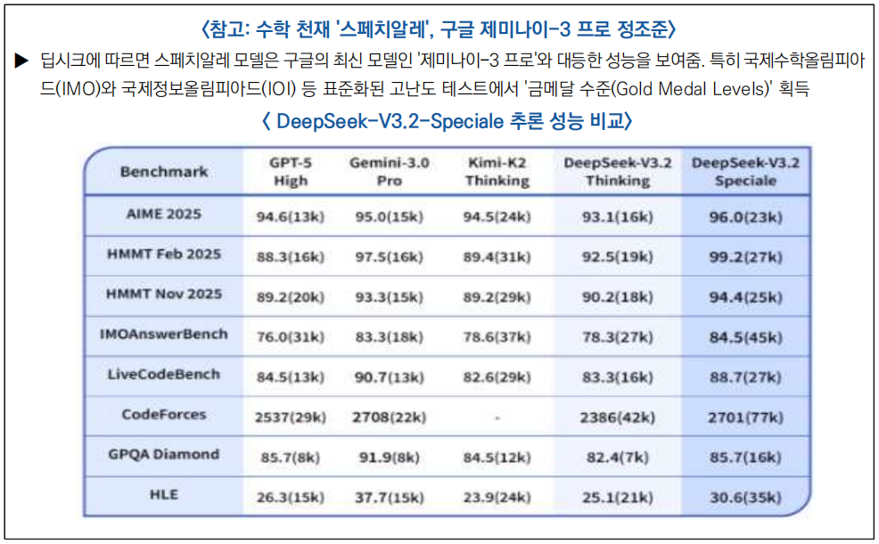 - DeepSeek-V3.2는 일상적 활용에 최적화된 모델로, 공개 추론 테스트에서 GPT-5 수준에 도달했으며 구글의 제미나이 3.0 Pro보다 약간 낮은 성능을 보유