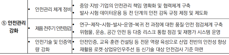 - ① 산업 생태계의 효율적 협동, ② 연구·생산의 안전 운영, ③ 산업 규모 확대, ④ 혁신역량 강화, ⑤ 국가–민간 자원 공동 활용, ⑥ 거버넌스·감독의 체계화를 동시에 달성