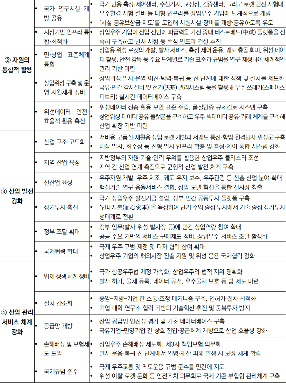 - (투자 구조 전환) ‘장기 자본’ 육성과 국가 상업우주 발전기금 설립을 명시해, 단기 수익 중심의 투자 구조에서 벗어나 핵심 기술력·사업 지속가능성을 중요시하는 장기투자 생태계로 전환