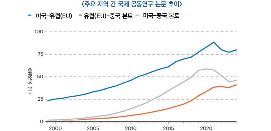 - 반면 미국–중국 공동연구는 2019년 전후 정체 이후 감소 국면에 진입*