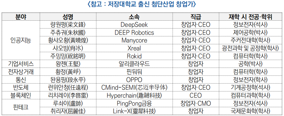 ○ 저장대학교는 중국 내에서 상장기업 창업자를 가장 많이 배출한 대학 중 하나로 평가되며, 2024년 기준 저장대 동문 351명이 상장기업의 창업자·대표이사 등 핵심 경영진으로 활동하고 있음