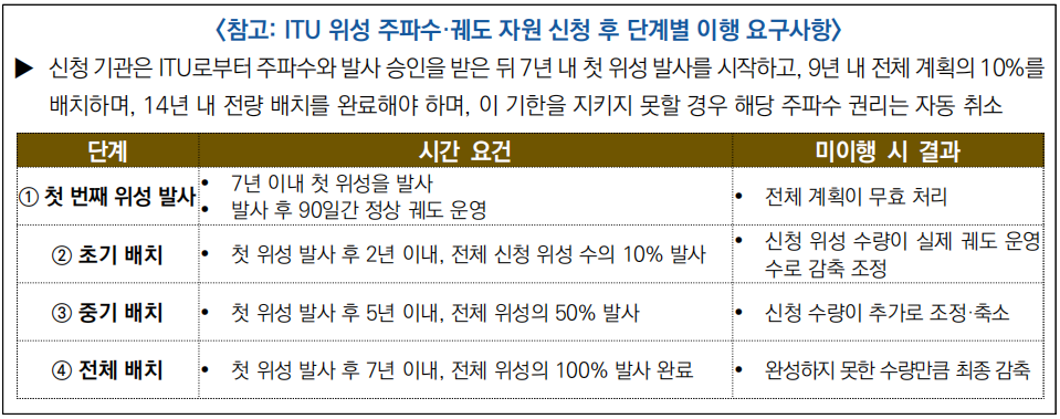○ (추진 배경) 국제전기통신연합(ITU)은 인공위성이 사용하는 주파수와 궤도 자원에 대해 “먼저 신청한 국가가 우선권을 갖는 원칙”을 적용하고 있음