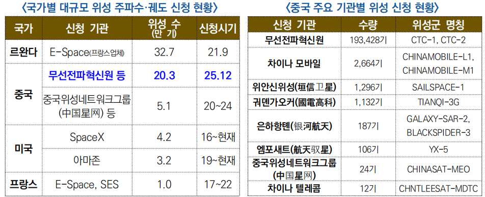 ![]() ○ (신청 규모) 국제전기통신연합(ITU) 공개 자료에 따르면, 중국은 2025년 12월 총 20만 3천 기 규모의 신규 위성 주파수·궤도 자원 신청을 제출