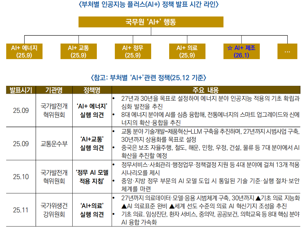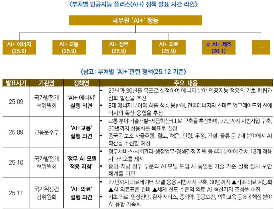 ○ (배경) 중국은 「‘AI+’ 행동」(25.8)을 기점으로 부처별 후속 정책들을 잇따라 발표하고 있으며 ‘중앙정부 가이드라인 → 부처별 실행계획 → 산업별 현장 확산’으로 이어지는 추진 체계를 구축 중