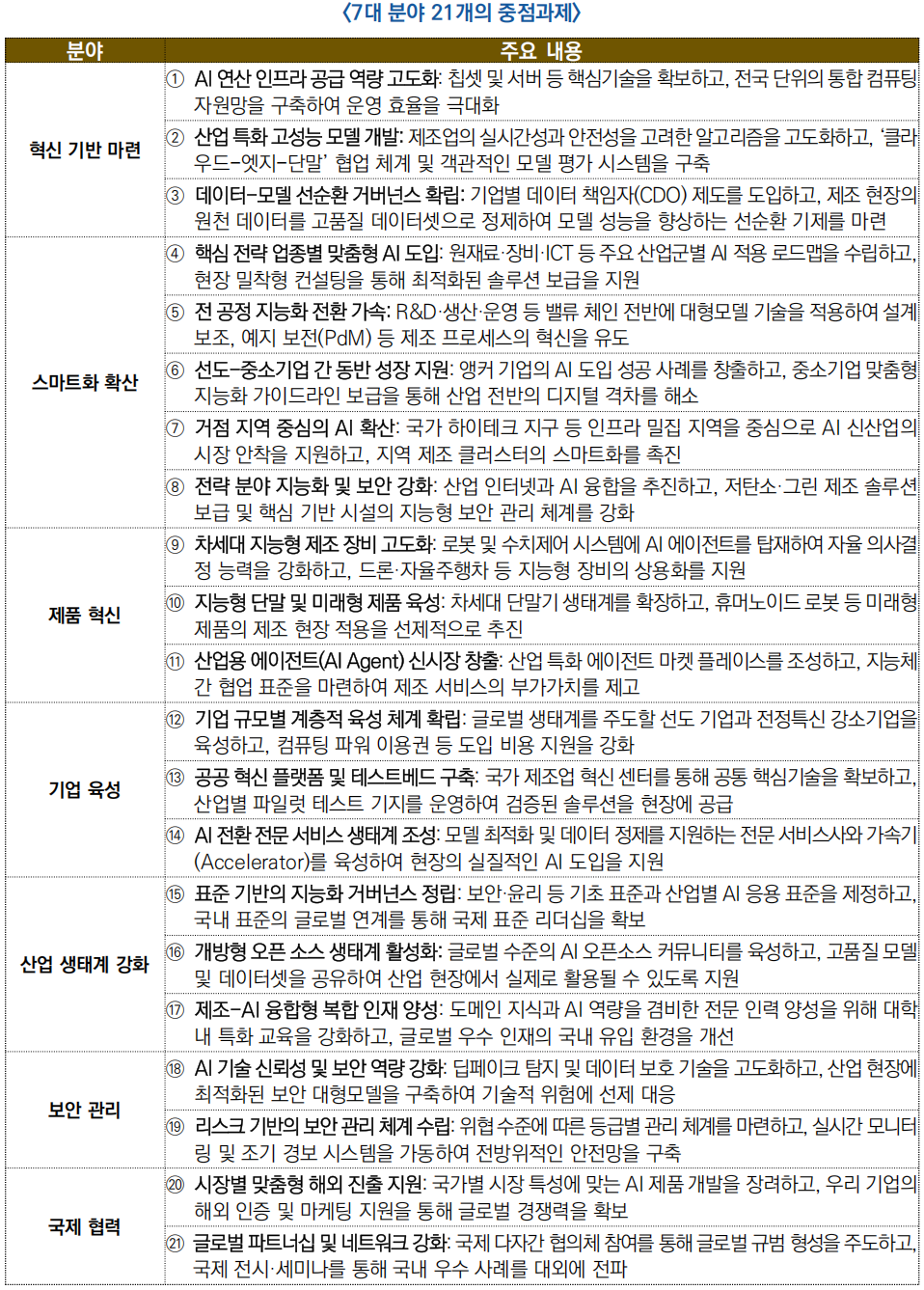 ○ 주요 내용으로 혁신 기반 마련부터 국제 협력까지 아우르는 7대 분야의 21개 중점과제를 설정