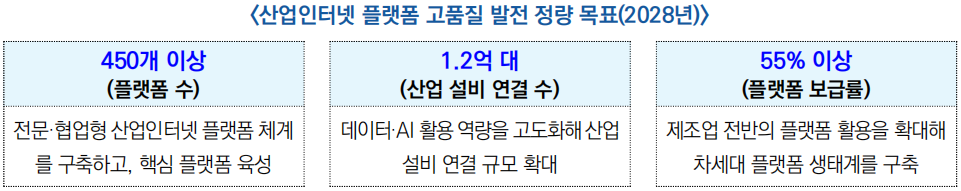 ![]() ○ (목표) 방안은 ‘플랫폼 차별화 + AI 융합 + 현장 적용’을 핵심 축으로, 2028년까지 차세대 산업인터넷 생태계 구축