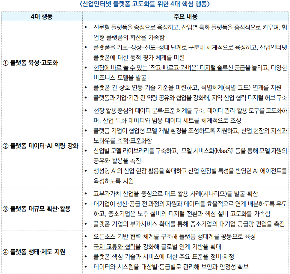 ![]() ○ (내용) 주로 플랫폼 육성, 데이터·AI 역량 강화, 현장 확산, 생태계 구축의 4대 행동을 통해 산업인터넷의 고품질·규모화 발전을 추진