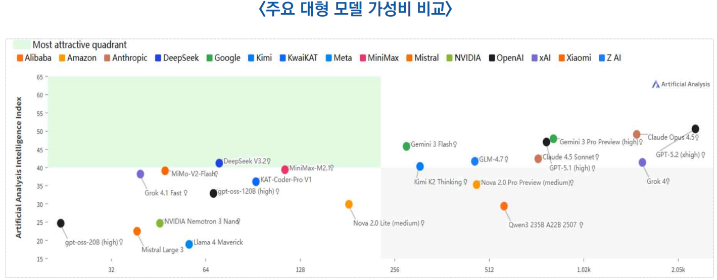 ![]() ○ Artificial Analysis의 데이터에 따르면, 1달러당 대형모델의 지능(intelligence) 수준을 기준으로 평가했을 때, DeepSeek·MiniMax 등 중국 오픈 소스 모델의 가성비가 Gemini·Claude·ChatGPT 등 주요 글로벌 모델보다 현저히 높은 것으로 나타났음