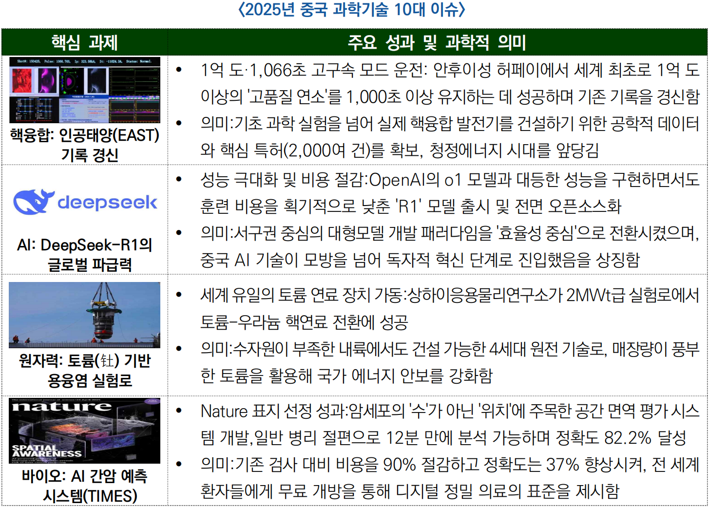 ○ 이번 선정 결과는 핵융합, AI, 원자력, 바이오 등 전략기술 분야에서 중국이 이룩한 독자적인 성과와 세계적 영향력을 입증함