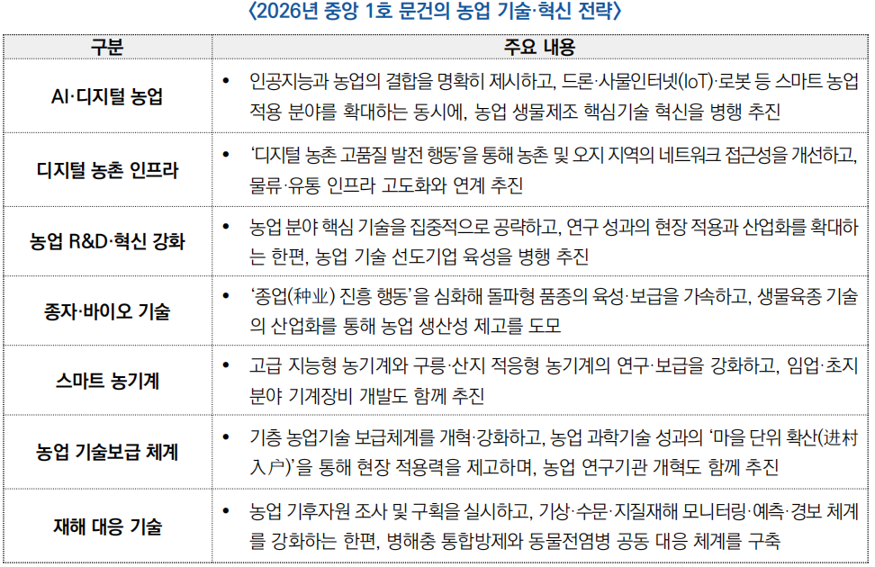 ○ 특히, 농업 과학기술 혁신을 AI·종자·스마트 농기계 중심으로 구체화하고, 기술 보급·재해 대응·디지털 인프라를 연계해 농업 현대화의 실행력을 제고