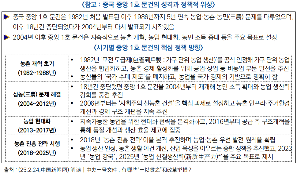 * 2025년 중앙 1호 문건은 기존 농촌 진흥 정책을 기반으로 ‘농업 신질 생산력’ 개념을 처음으로 도입하여, 인공지능, 드론 등 첨단 기술을 활용한 농업 현대화 및 국제 경쟁력 강화를 추진