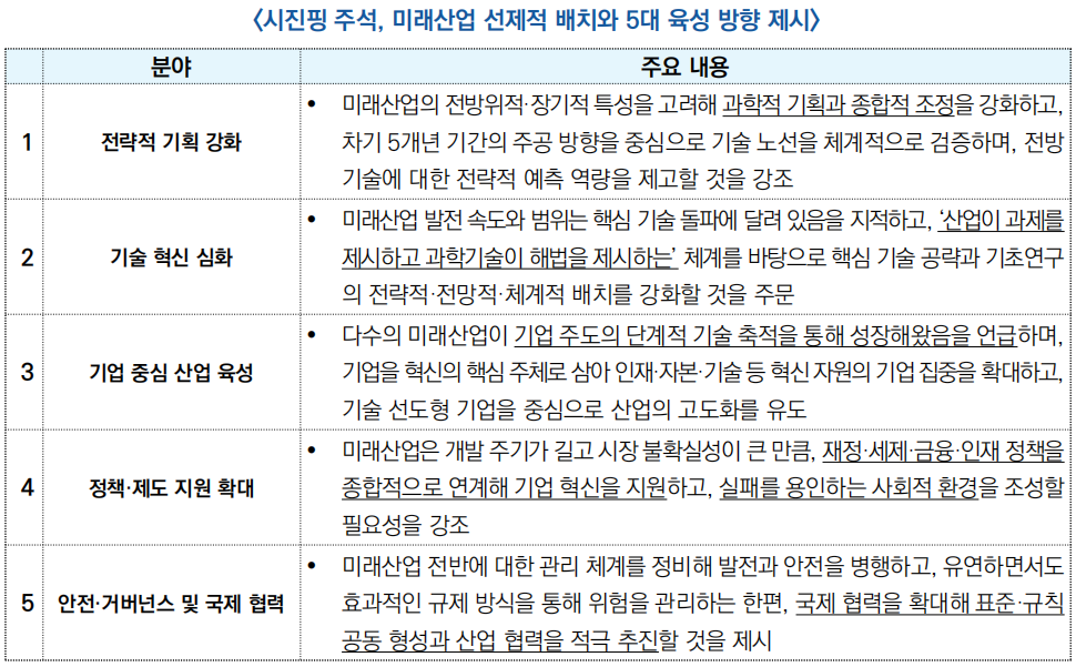 ![]() ○ (시진핑 주석 주요 연설 내용) 미래산업 분야에서 ①전략적 기획 고도화 ②핵심기술 혁신 ③기업 주도 산업 육성 ④정책·제도 지원 강화 ⑤안전·거버넌스 및 국제 협력 심화를 전방위적으로 추진할 것을 지시