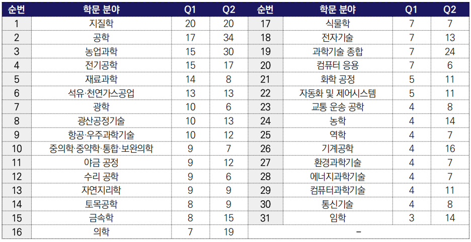 ![]() ○ 2025년 중국 과학기술 학술지는 지질학, 공학 종합 등 31개 학문 분야에서 두드러진 성과를 보였으며, 각 분야별 상위 50% 이내에 진입한 학술지가 모두 10종 이상을 기록