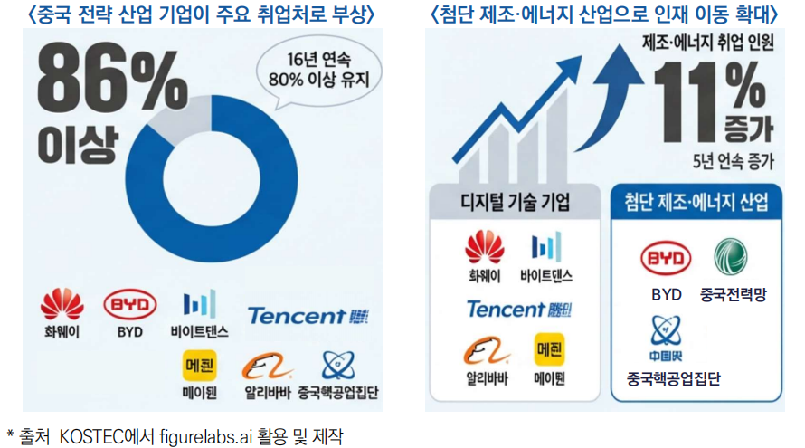 ○ 칭화대 졸업생 진로는 해외 유학 감소, 제조·에너지·국방 분야 유입 증가, 북경 외 지역 분산, AI 중심 기술 인력 확대 등의 특징을 보이며, 이는 중국 최고 대학 인재가 인터넷 플랫폼이나 대도시 집중 경로를 넘어, 국가 전략산업과 지역 거점, 첨단기술 현장으로 재배치되는 구조적 변화를 시사함