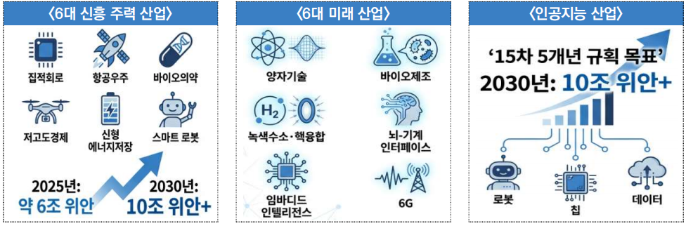 ** 6대 미래산업 : 양자기술, 바이오제조, 녹색수소·핵융합에너지, 뇌-기계 인터페이스, 임바디드 인텔리전스, 6G