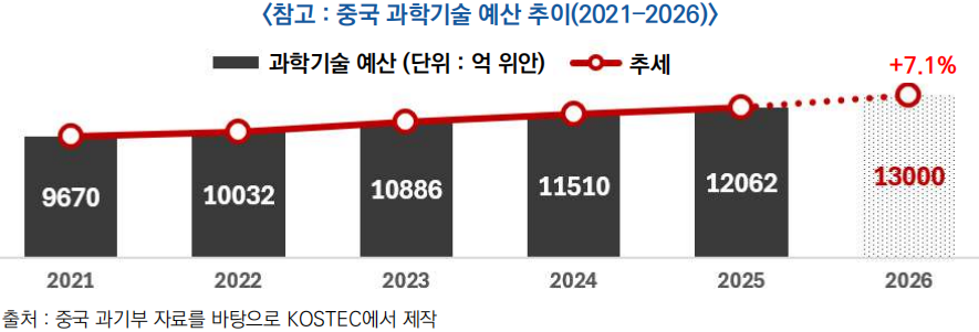 - 2026년 전국 과학기술 예산은 약 1.3조 위안(약 278조 원)으로 전년 대비 7.1% 증가
