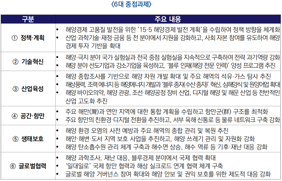 - (기술) 해양 핵심 장비와 기술을 빠르게 확보하는 한편, 디지털화·지능화 전환과 해양 인재 양성을 통해 기술 경쟁력을 강화