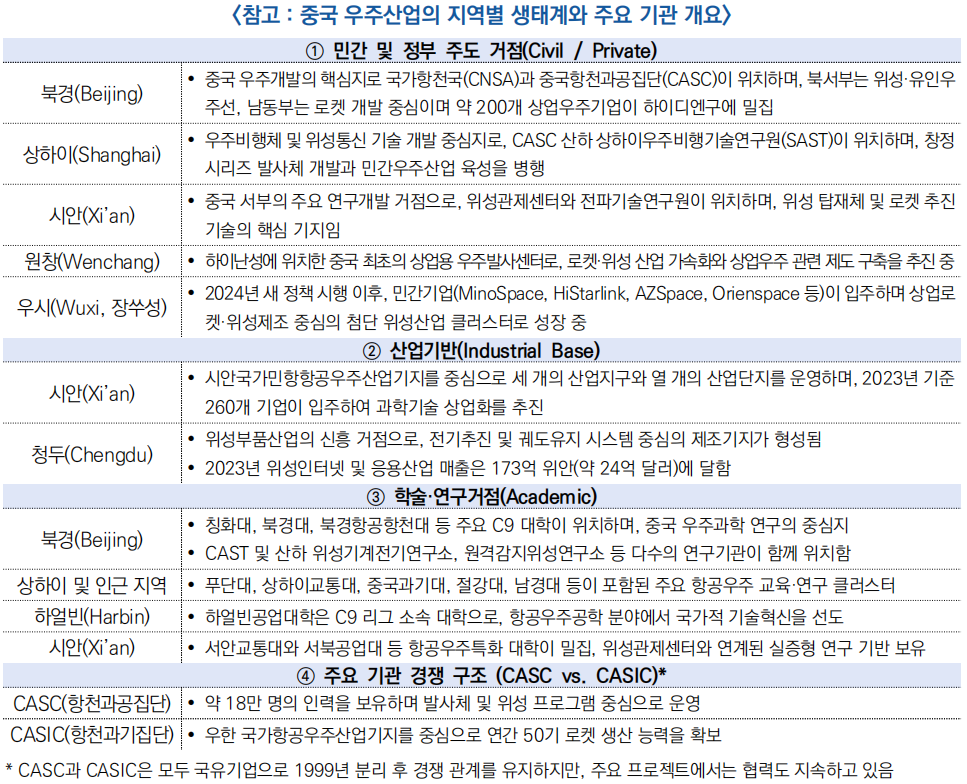 - 북경은 정책·기업·연구기관이 집중된 핵심 거점, 상하이는 위성·발사체 개발 중심지, 시안은 서부 연구개발 거점으로 기능