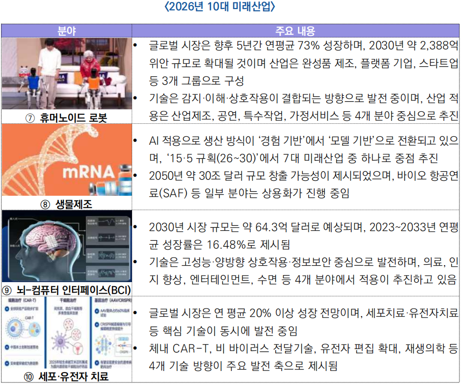 ○ 26년 10대 미래산업 분야는 휴머노이드 로봇, 생물제조, 뇌-컴퓨터 인터페이스, 세포·유전자 치료, AI 에이전트, 저고도 장비, 핵융합, 자율주행, 위성 인터넷, 양자컴퓨팅 등으로 구성