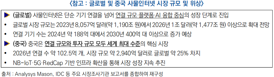 □ 중국 공업정보화부 등 9개 부처는 ‘사물인터넷 산업 혁신발전 행동계획(2026~2028년)’을 발표하고, 표준·기술·응용·데이터를 포괄한 산업 고도화 추진 방향을 제시(2026.3.31)