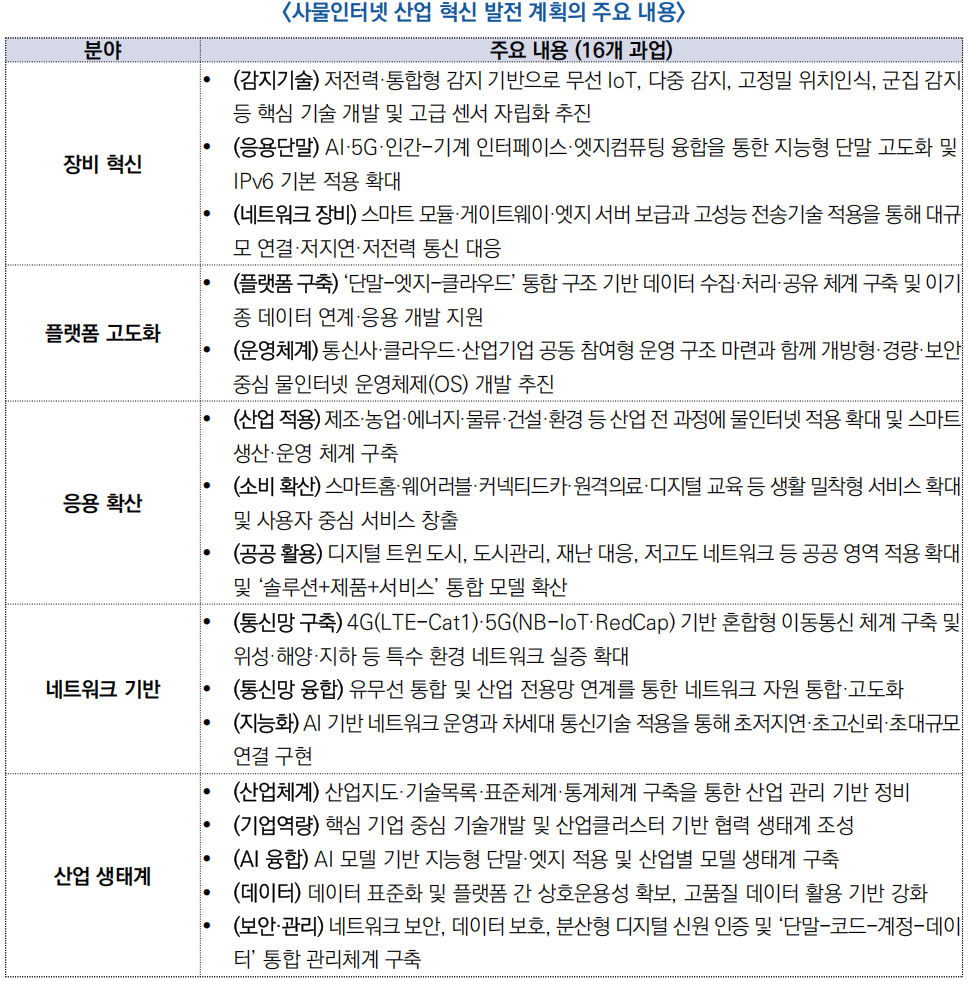 - 다만 핵심 기술 일부의 해외 의존, 기기 간 연동 부족, 네트워크·데이터 보안 문제 등 구조적 과제 존재