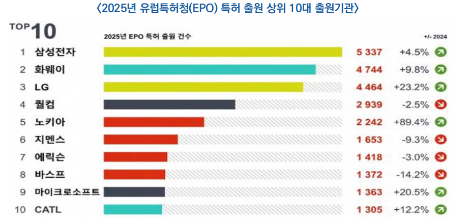 ![]() ○ (출원 기관) 2025년 EPO 상위 출원기업은 삼성(5,337건, +4.5%)·화웨이(4,744건, +9.8%)·LG·퀄컴·노키아 순으로 나타났으며, 한국과 중국 기업은 상위권 위치를 유지