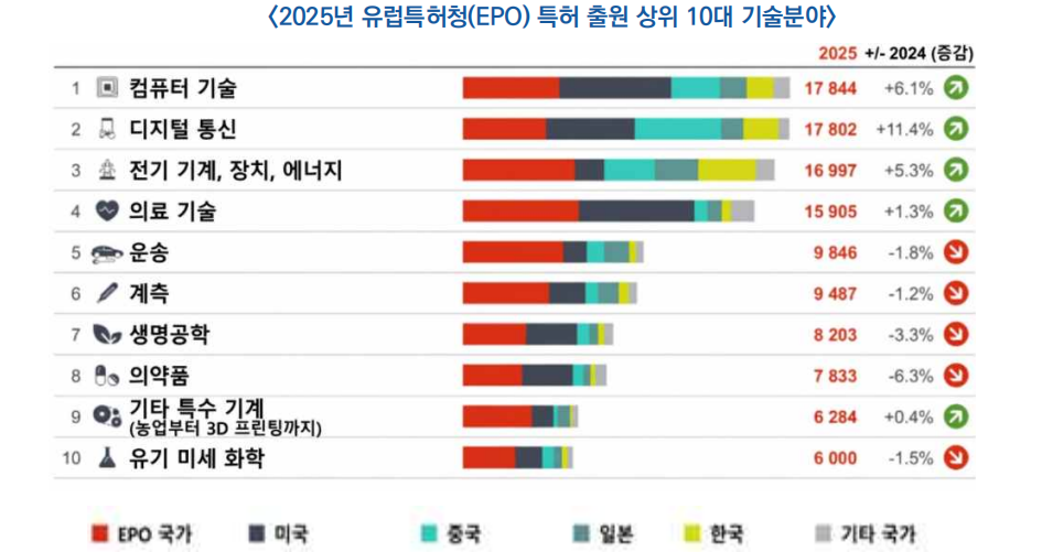 □ 유럽특허청(EPO)의 2025년 특허 출원은 사상 처음으로 20만 건을 넘어섰으며, 디지털·에너지 기술이 증가세를 주도한 것으로 나타났음