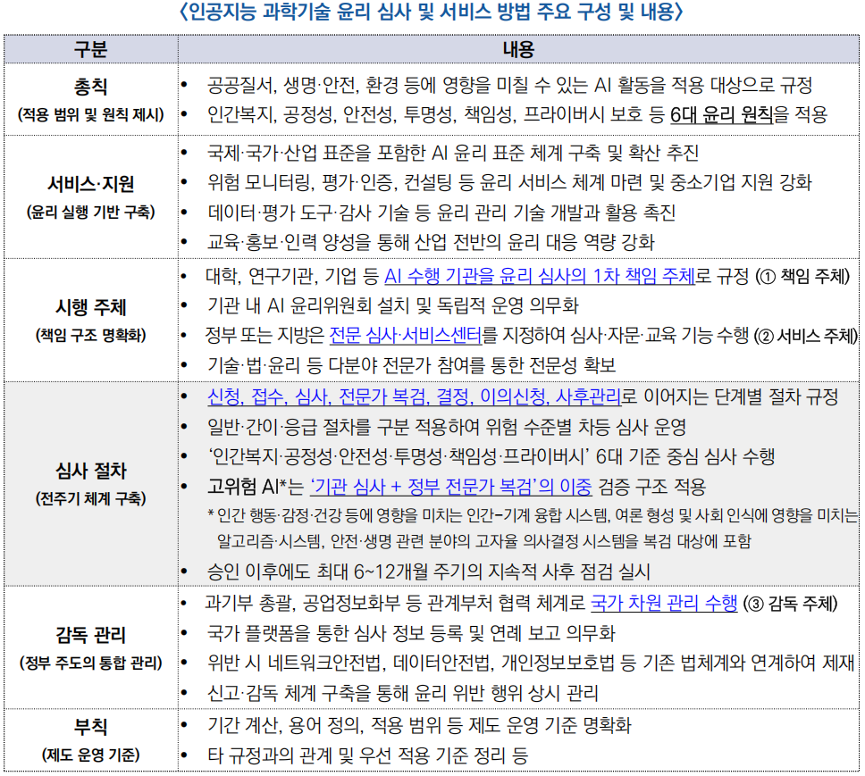 ○ 방법은 총칙, 서비스·지원, 시행 주체, 심사 절차, 감독 관리, 부칙의 6개 장으로 구성되며, 특히 심사 절차를 중심으로 전주기 윤리 관리체계를 구체화