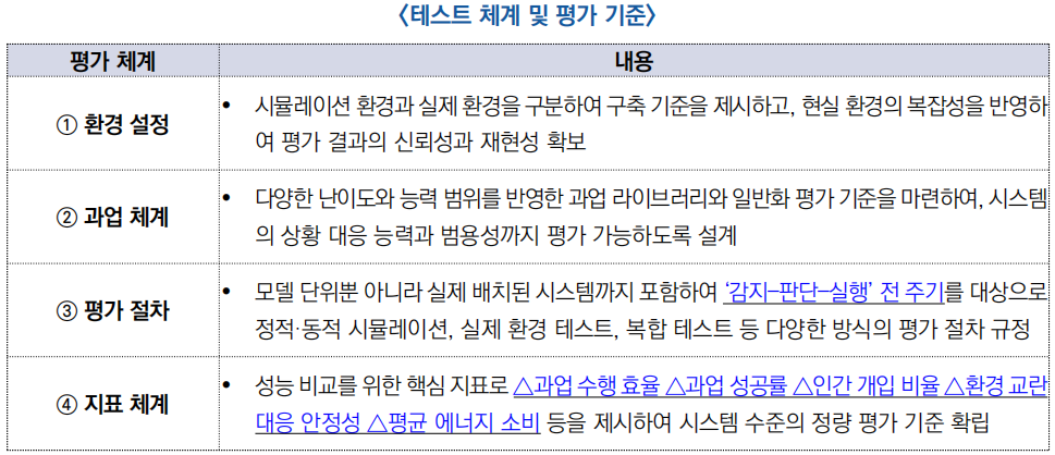 ![]() ○ (내용) 환경·과업·절차·지표로 구성된 4대 평가 체계를 기반으로 통합 테스트 프레임워크 제시