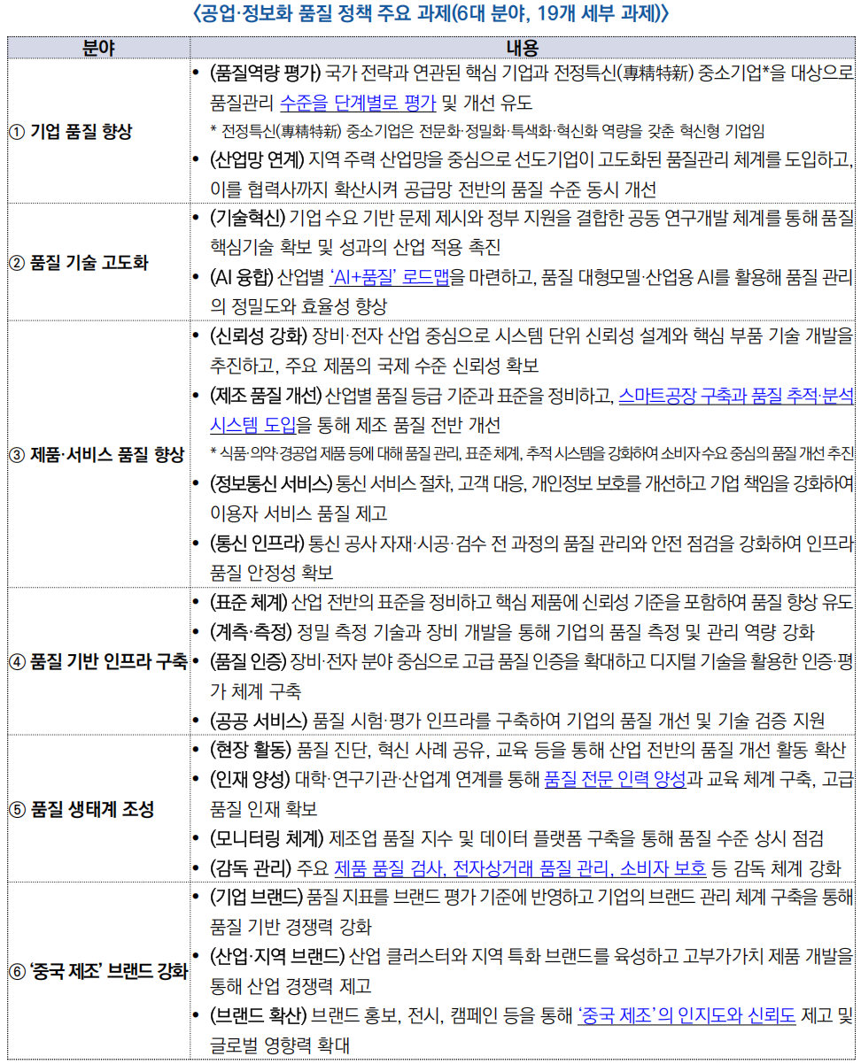 - 전국 공업정보화 업무회의(2025.12)는 산업 혁신, 전통 산업 고도화, 신산업 육성, 디지털 전환 등 주요 정책 추진에서 품질 경쟁력을 핵심 기반 요소로 설정