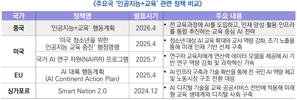 - (전주기 도입) 중국은 초·중·고등학교부터 대학, 직업교육, 평생교육까지 전 과정에 AI 교육을 도입하고, 교육 단계별 기능과 역할을 체계적으로 정립