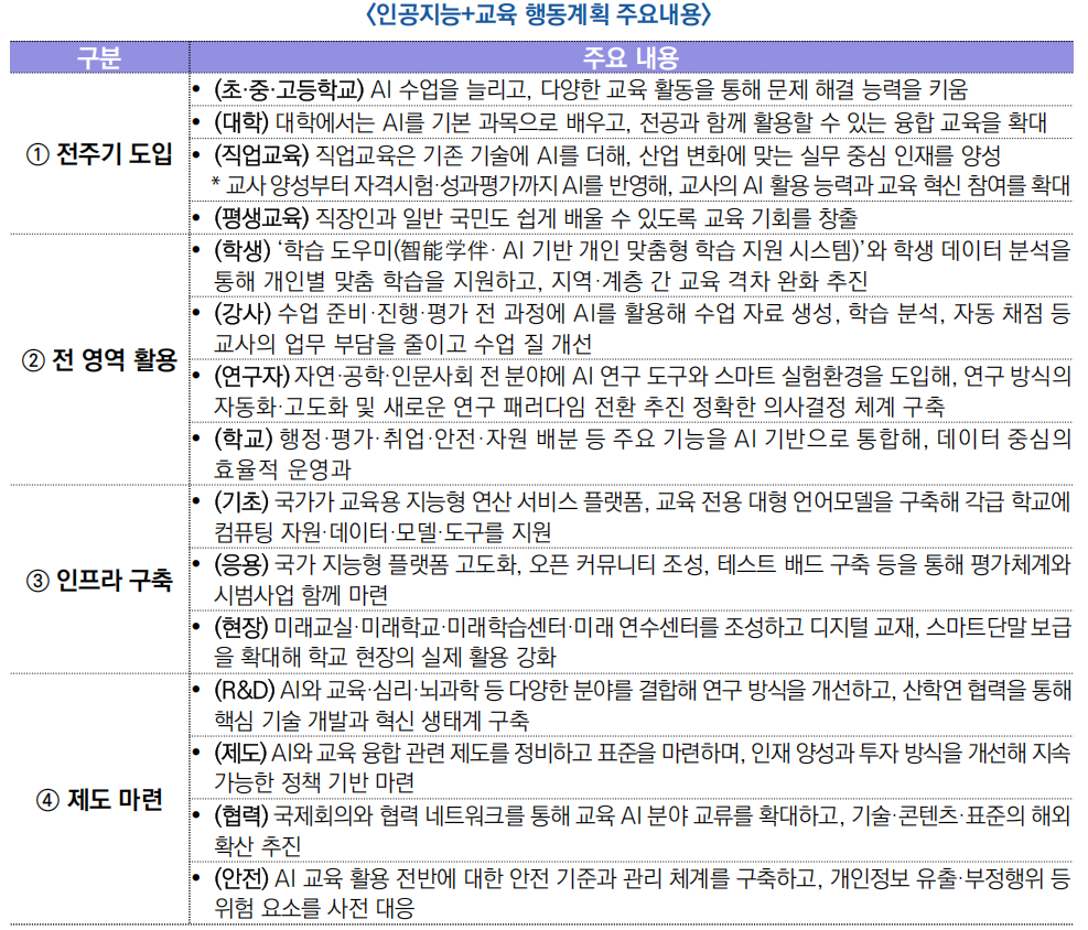 - (인프라 구축) 국가 차원의 연산력·데이터·모델·플랫폼을 통합 구축해, 학교 현장에서 AI를 안정적으로 활용할 수 있는 환경 마련