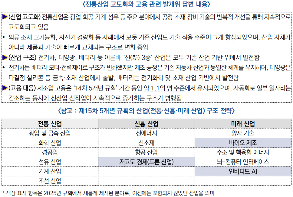 ○ 전통산업은 신산업의 기반으로서 지속적으로 고도화되는 핵심 축이며, 기술혁신에 따른 고용 변화에 대응하면서 ‘산업 고도화+고품질 고용’을 동시에 추진하는 방향으로 정책이 설계됨