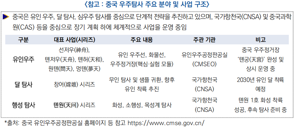 - 심우주 탐사 분야에서는 ‘톈원 2호’ 소행성 탐사·샘플 귀환 임무 착수, ‘톈원 1호’는 화성 전역 및 지역 탐사 지속해 약 3.5TB 과학 데이터 공개