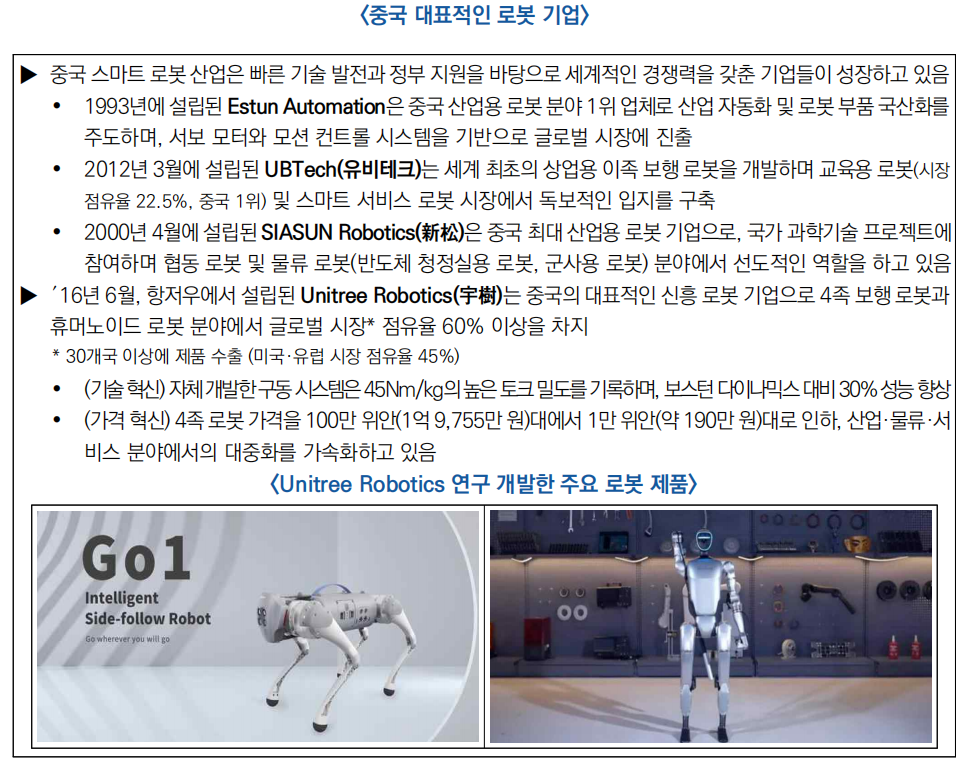 ![]() □ 최근 Unitree Robotics(宇樹科技) 창립자 왕싱싱(王興興)은 로봇 기업 대표로 중국 정부의 민영기업 고위급 좌담회에 초청됨에 따라, 중국 스마트 로봇 산업에서의 전략적 중요성이 부각