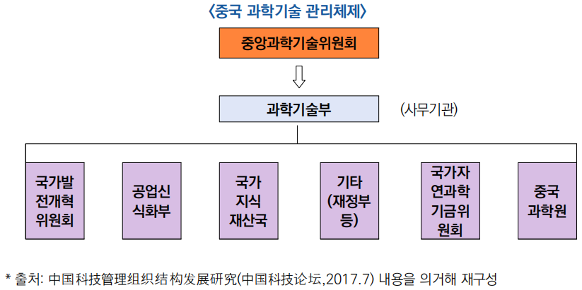 - (집행) 과학기술부(MOST)와 국가발전개혁위원회(NDRC), 공업정보화부(MIIT) 등 국무원 소속 부처들은 기능을 분담하여 공동으로 과학기술을 관리하고 있음